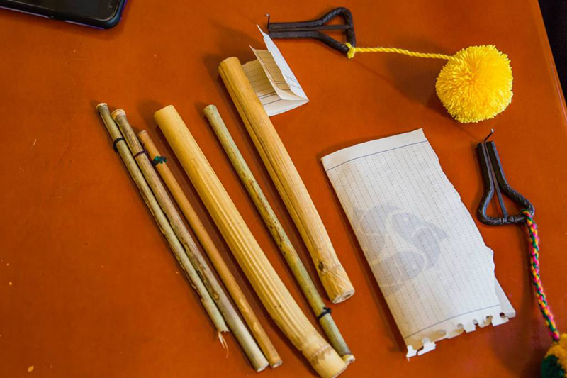 Em sua mochila a tiracolo ele guarda uma pequena caixa de madeira onde estão duas maasi, as pequenas e delicadas flautas, mas o que ele tira de lá é o berimbau de boca. Estalando sua haste de metal ritmadamente, Joaquin faz o instrumento produzir um som característico, entre o cômico e o hipnótico. Há um saber tradicional e uma resistência ancestral no ato. “Nós fazemos os instrumentos com materiais da natureza, como casca de frutas, plantas e madeira, que tem de ser cortada no tempo certo, sob a Lua, para suportar as más energias, para ter o toque de cura espiritual e afastar o inferno.”