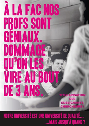 O novo tipo de contrato que se propõe não é apenas temporário – trata-se de um contrato temporário por projeto de pesquisa, o que torna intermitente o trabalho e precário o vínculo, não apenas com a universidade, mas também com estudantes e com a formação para a pesquisa científica. Não é por acaso que o cartaz diz: “Na faculdade, nós somos formados por pesquisadores. Quando eles não estão procurando os financiamentos”. O trabalho na universidade se submete ao empreendedorismo por projetos, a captação e gestão de recursos, e os resultados medidos pela sua aplicabilidade e rentabilidade. E como os financiamentos públicos estão em queda, se propõe o aumento das parcerias público-privadas e o uso de recursos privados para financiar pesquisa. Seja estatal ou empresarial, a avaliação da pesquisa é feita por organizações externas às universidades e laboratórios de pesquisa, com orientação acentuada para a competitividade econômica. A Coordenação Nacional de Faculdades e Laboratórios de pesquisa em luta considera a lei mais um passo no avanço da mercantilização da Universidade que as políticas neoliberais têm imposto, junto a essa complexidade de diversas reformas e mudanças estruturais. [6] Além do “coquetel” de reformas – da lei trabalhista, da reforma da previdência, do seguro-desemprego, da lei da mudança da função pública, que afetam a todos e todas, as reformas da educação básica e superior alteram drasticamente a forma e função da educação pública no país. A LPPR prevê o aumento de 9% do trabalho de técnicos administrativos, sem aumento salarial. A mudança na avaliação da passagem do ensino médio para o ensino superior (o famoso BAC e PacourSup) e a cobrança e aumento de taxas para ingressar na universidade pública, que afeta sobretudo estudantes não europeus e das classes populares, deixa ainda mais clara a intenção de criar um sistema desigual. Vale dizer que para não europeus a taxa cresceu 1600% neste ano de 2019-2020. [7] E é preciso aqui observar que a discussão de cobrança de taxas, que começa como um simples ato de “contribuição” daqueles que – em tese – podem pagar, pode, e deve mesmo, conduzir a uma privatização do serviço em termos clássicos, estabelecendo relação de troca mercantil pelo serviço educativo.