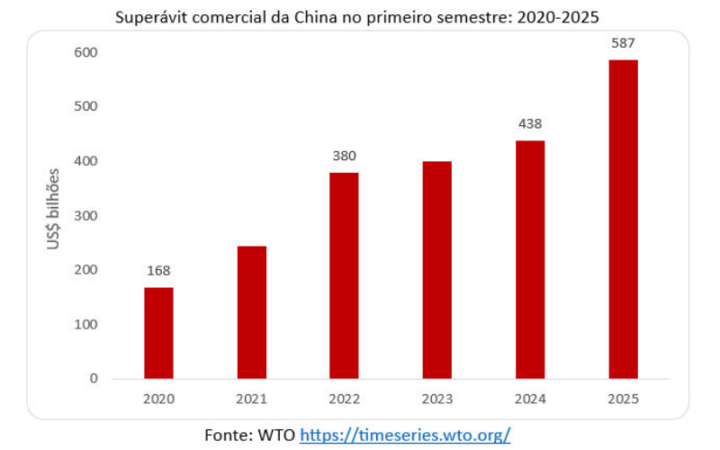 O gráfico abaixo mostra o superávit comercial da China no primeiro semestre (janeiro-junho) de 2020 a 2025. Nota-se que o saldo comercial foi de US$ 168 bilhões no primeiro semestre de 2020 (durante a pandemia), chegou a US$ 380 bilhões em 2022, a US$ 438 bilhões em 2024 e deu um salto para US$ 586,5 bilhões no primeiro semestre de 2025.