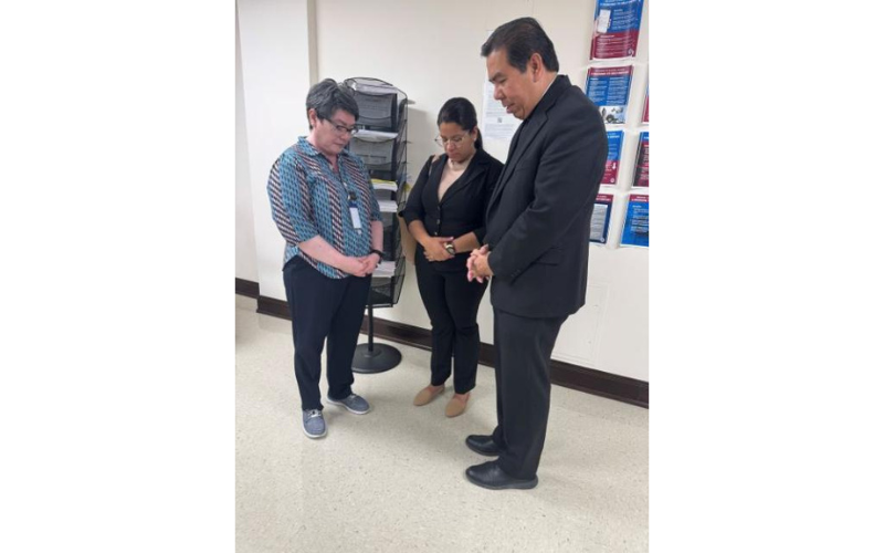 A Irmã Leticia Gutiérrez Valderrama, à esquerda, junta-se ao bispo auxiliar de El Paso, d. Anthony Celino, enquanto rezam com uma mulher em uma sala de um tribunal de imigração em El Paso, em 25 de junho. (Foto: National Catholic Reporter)