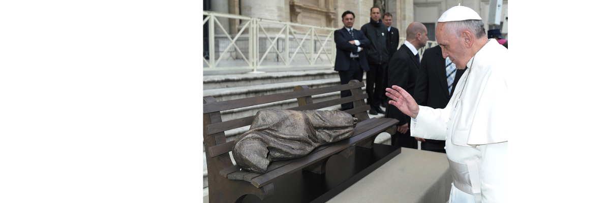 O Papa Francisco abençoa a escultura "Jesus, o Sem-teto" durante sua audiência geral na Praça de São Pedro, no Vaticano, em 20 de novembro de 2013. (Foto: CNS/L'Osservatore Romano)