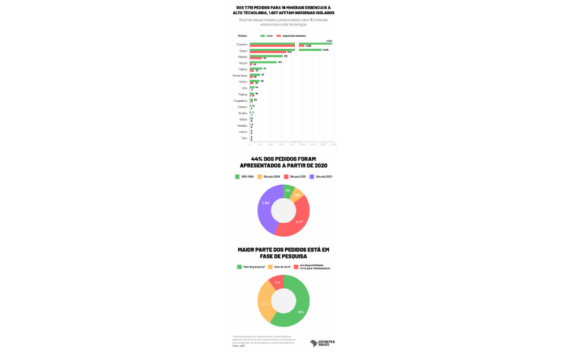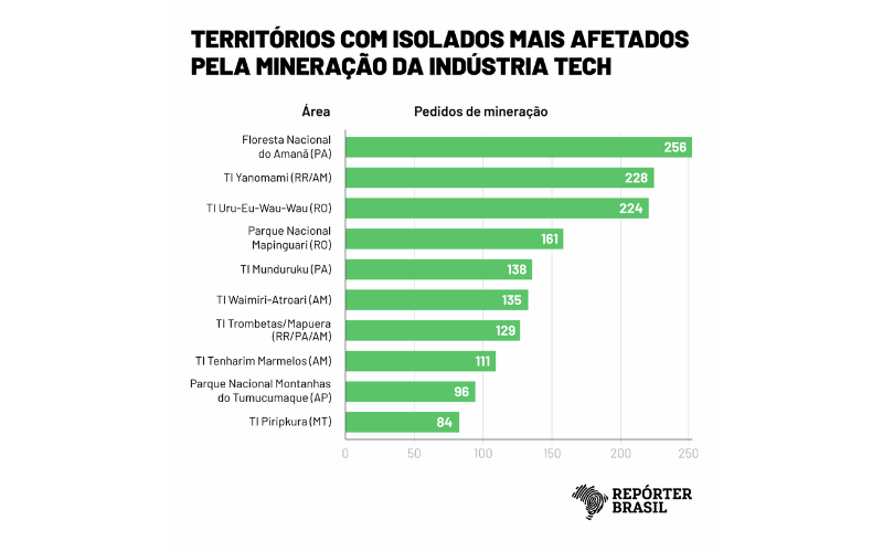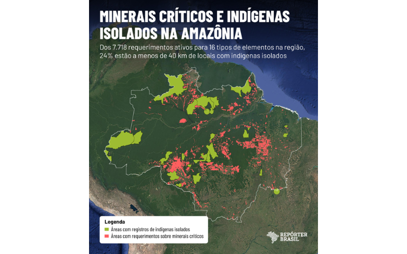 A análise da Repórter Brasil, realizada com apoio da Rainforest Investigation Network, do Pulitzer Center, cruzou informações de localização dos povos isolados, fornecidas pelo OPI, com os pedidos de exploração de 16 minerais críticos na Amazônia, extraídos da base da ANM (Agência Nacional de Mineração). A lista inclui cobalto, cobre, estanho (cassiterita), grafita, lítio, nióbio, níquel, platina, silício, tálio, tântalo, terras raras, titânio, tungstênio, urânio e vanádio.