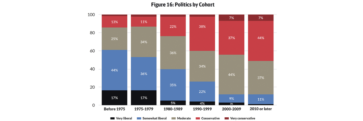 "Entre os ordenados antes de 1975, 61% se identificaram como 'muito' ou 'um pouco' liberais e menos de 15% como conservadores", relata o estudo. Entre os ordenados desde 2010, quase metade (51%) se identificou como 'muito' ou 'um pouco' conservadora, e apenas cerca de um em cada dez como liberal."