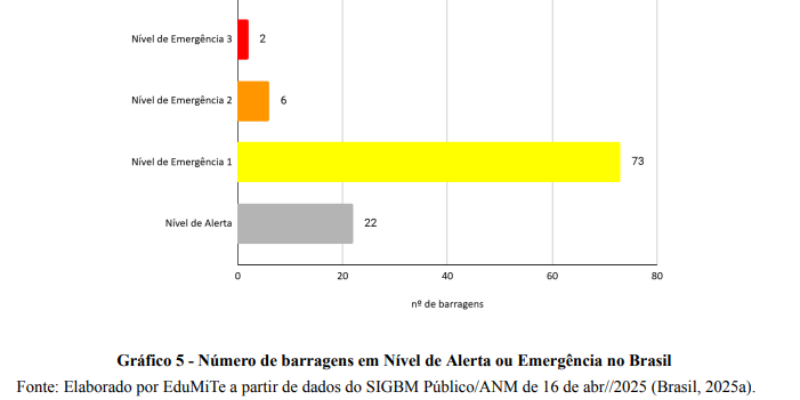 Em maio de 2025, das 911 barragens que constam no Sistema de Gestão de Segurança de Barragem de Mineração Público (SIGBM) da Agência Nacional de Mineração (ANM), 103 estão em Nível de Alerta (NA) ou de Emergência (NE) acionados. Deste total, são 22 em NA e 81 em NE, com aumento considerável sobre os dados disponíveis ainda em janeiro deste ano.