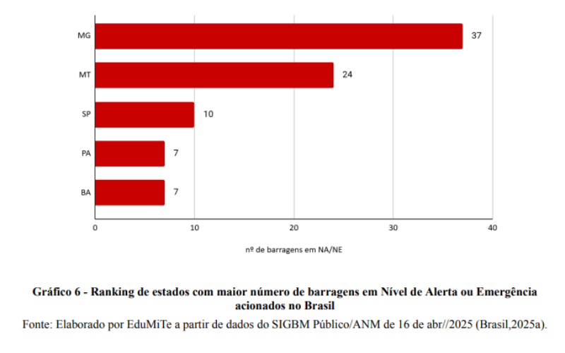 Dentre as 911 barragens registradas no país em abril de 2025, 331 se localizam em Minas Gerais, ou seja, 36,33% do total nacional. Quanto às barragens em NA ou NE acionados, MG também se destaca, pois conta com 37 das 103 barragens em NA ou NE no Brasil, registradas na ANM em abril de 2025.