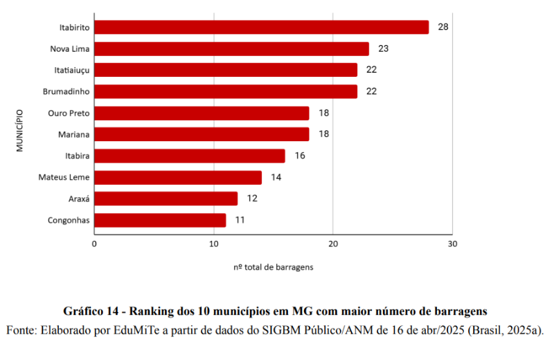 O levantamento também reúne desde março deste ano o ranking de municípios no Brasil com maior número de barragens, especialmente em Minas Gerais e no Quadrilátero Ferrífero-Aquífero (QFA) do mesmo estado, pois é o local do país com maior concentração total de barragens em Nível de Alerta e Emergência.