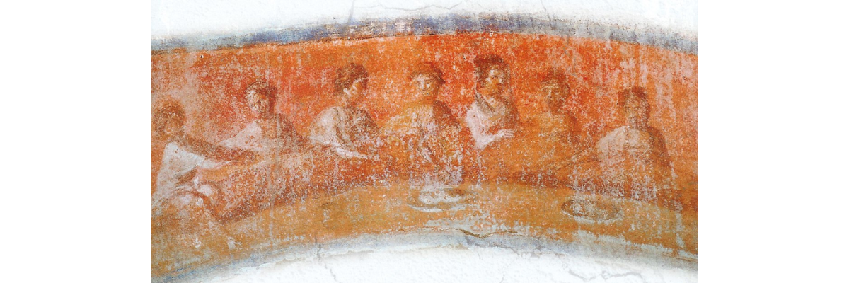 A MEMÓRIA DA PEDRA: Afresco da “Fractio Panis” nas Catacumbas de Priscila. A mulher preside o serviço da mesa e do pão. Antes da clericalização medieval, a “Ur-Diakonia” não tinha gênero. Licença: Wikimedia Commons