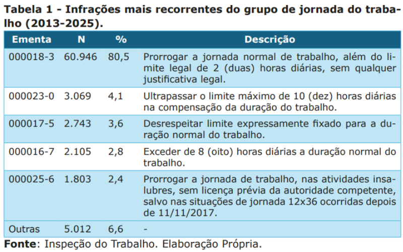 Tabela das infrações mais recorrentes do grupo de jornada do trabalho (2013-2025) - (Fonte: Inspeção do Trabalho. Elaboração Própria).