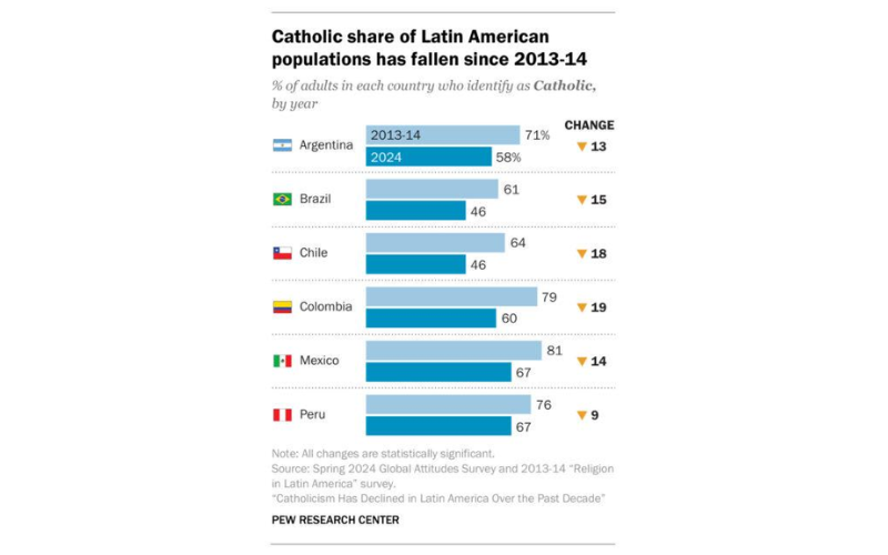A pesquisa, realizada em 2024 e divulgada na quarta-feira (21 de janeiro) pelo Pew Research Center, analisou Argentina, Brasil, Chile, Colômbia, México e Peru e constatou taxas decrescentes de catolicismo em todos os países. A Colômbia apresentou a maior queda, onde 6 em cada 10 (60%) adultos se identificaram como católicos em 2024, em comparação com 8 em cada 10 (79%) na pesquisa de 2013-2014.