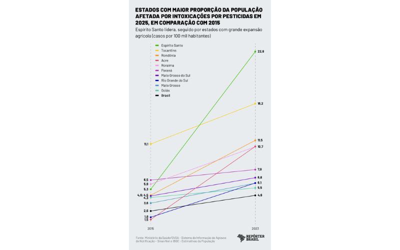 O Espírito Santo foi o estado com maior índice de intoxicações em 2025, seja em números absolutos ou proporcionais. Foram 941 registros — quase um em cada dez casos do país — e uma taxa de 23 casos por 100 mil habitantes. Em seguida, proporcionalmente, aparecem Tocantins (16 por 100 mil) e Rondônia, Acre e Roraima (com 11 casos por 100 mil habitantes cada), todos estados da região Norte, marcada pela expansão do agronegócio e pressão sobre áreas de floresta.