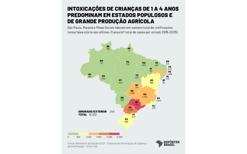 O Brasil viveu em 2025 o pior ano em intoxicações por agrotóxicos desde 2015, com 9.729 casos, revelam dados do Ministério da Saúde analisados pela Repórter Brasil; nos últimos 11 anos, um quarto das vítimas foram crianças de 1 a 4 anos.