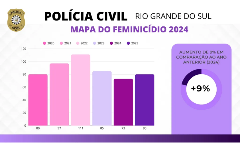 O número de feminicídios no Rio Grande do Sul foi de 80 casos em 2020, 97 em 2021, 111 em 2022, 85 em 2023, 73 em 2024 e voltou a 80 em 2025, segundo a Polícia Civil.