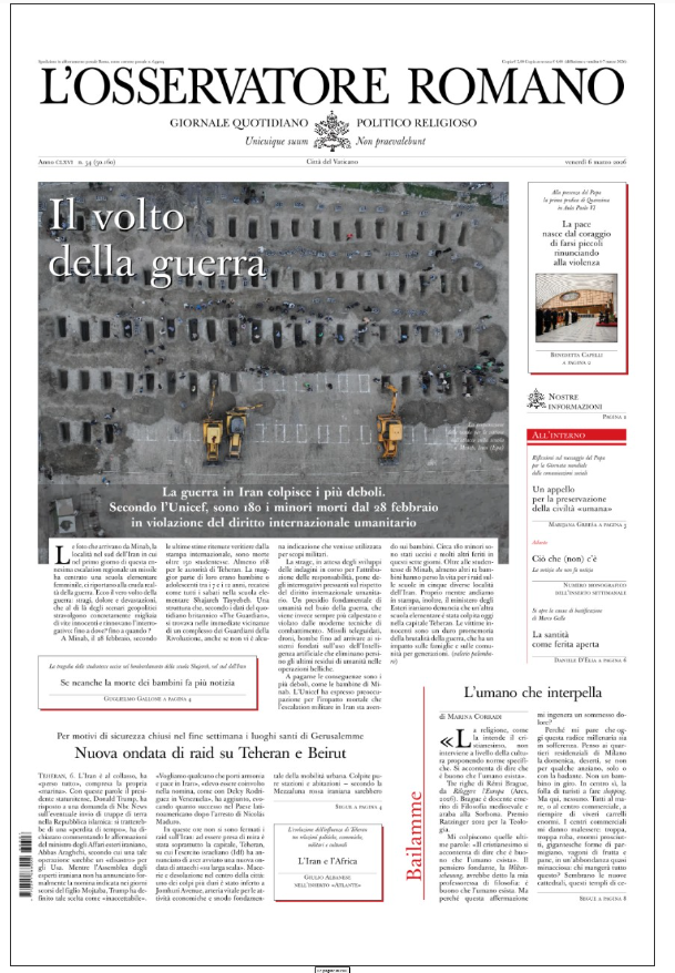 O Vaticano não hesita em apontar claramente a violência que condena. O L'Osservatore Romano, jornal da Santa Sé, estampou em sua primeira página, na sexta-feira, uma enorme fotografia aérea mostrando as valas comuns cavadas para enterrar os corpos de 180 crianças mortas no bombardeio de um jardim de infância no Irã. A manchete dizia "A Face da Guerra". No dia anterior, o segundo em comando da Santa Sé, o secretário de Estado Pietro Parolin, havia condenado o conceito de guerra preventiva e o desmantelamento do direito internacional.