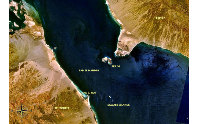 Fotografia aérea do trecho Bab-el-Mandeb (Fonte: Nasa/WorldWind software | Wikimedia Commons).