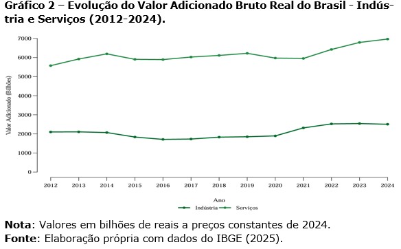 O Gráfico 2 desagrega o crescimento do Valor Adicionado Bruto entre as duas principais atividades econômicas do Brasil: Serviços e Indústria. Optou-se, neste momento, por não apresentar o setor da Agropecuária no próximo gráfico para fins de melhor visualização dada a diferença entre a participação de cada atividade no valor adicionado. Enquanto Serviços e Indústria com- põem juntos mais de 90% do Valor Adicionado Bruto da economia, o setor Agropecuário representa pouco menos de 7% em 2024 (IBGE).