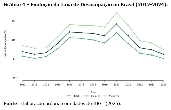 O viés do conflito trabalho-família, portanto, ressurge como um instrumento de análise também para o caso brasileiro, que conta com um desequilíbrio na acomodação de atividades de cuidado, que recaem desproporcionalmente sobre as mulheres. O Gráfico 4 demonstra a trajetória do nível de desemprego no Brasil ao longo do mesmo período analisado ante- riormente, de 2012 a 2024. O retrato que se obtém a partir deste recorte, para além de reforçar o quadro de desigualdade entre homens e mulheres no mercado de trabalho também no que se refere ao desemprego, revela uma volatilidade maior quando comparado ao caso chileno, em decorrência da crise política e econômica pela qual passou o Brasil a partir de 2015, chegando a ultrapassar a taxa de 12% em 2016. A pandemia da COVID-19, por sua vez, leva a um outro pico na taxa de desocupação, que chegou a 14% em 2020.