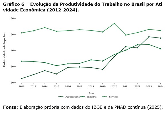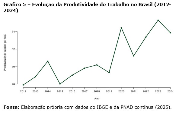 No que se refere à produtividade do trabalho, o Gráfico 5 demonstra uma trajetória de ganhos reais no Brasil ao longo do período compreendido entre 2012 e 2024. De forma similar ao restante dos indicadores já analisa- dos, destaca-se aqui a volatilidade do comportamento da produtividade do trabalho como um todo, em sincronia com alguns dos momentos de maior destaque na economia brasileira no período observado. Como em decorrência da natureza do cálculo da produtividade − uma razão entre o PIB e as horas trabalhadas −, os momentos de alta da produtividade coincidem com aqueles de maior desemprego na economia, como após a crise de 2015 e o período pandêmico.