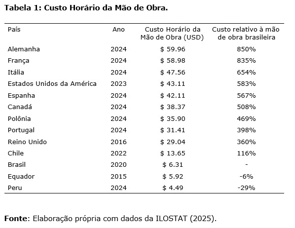 Quanto aos custos com trabalho, a Tabela a seguir revela que, quando comparado aos principais países da Europa e da América Latina, e em particular com o Chile que está experimentando uma redução da jornada de trabalho nesse momento, o Brasil ($6.31) apresenta custos com o trabalho significati- vamente mais baixos, à exceção somente do Equador e do Peru, mais baixos relativamente à mão de obra brasileira em 6% e 29%, respectivamente. Com relação aos países europeus, a mão de obra brasileira representa cerca de 14% do custo horário médio da mão de obra europeia. Finalmente em comparação ao Chile, o principal destaque é o fato do custo horário da mão de obra avaliada em $13.65, ser mais que o dobro da brasileira ($ 6.31), com o custo da mão de obra brasileira representando 46,3% da chilena. Ressalta-se que a imprecisão dos dados referentes à Argentina e ao Uruguai impediu a inclusão de ambos na Tabela 1.