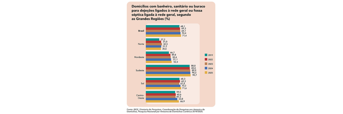 O Brasil saiu de 68,1% de domicílios com ligação à rede de esgoto em 2019 para 71,4% em 2025. À primeira vista, parece progresso. E é, mas é o tipo de avanço que precisa ser olhado com cuidado, porque a média nacional tem o poder perigoso de apagar o que está embaixo dela.
