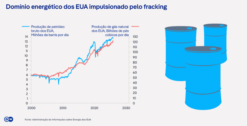 No sentido oposto, os EUA sob Donald Trump freiam o avanço das energias renováveis e aceleram a expansão das fontes fósseis. "Drill, baby, drill" ("Perfure, bebê, perfure"), repetia Trump a seus apoiadores ainda na campanha eleitoral. Perfurar sem parar também é o lema do secretário de Energia, Chris Wright, fundador e ex-CEO da Liberty Energy, uma das maiores empresas de fracking da América do Norte.