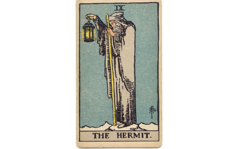 O eremita, imerso na solidão, encontra na luz tênue da sua vela o único reflexo da verdade, revelando uma sabedoria silenciosa que transcende o mundo exterior | Arte de Pamela Colman Smith