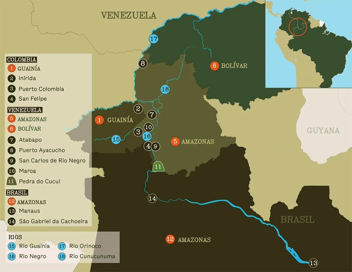 Várias minas já tiveram seu auge, e outras certamente virão. Mas atualmente Cunucunuma é o local que atrai mais interesse na região do Alto Orinoco: até 200 balsas em produção permanente, calcula Dairo. Cunucunuma fica na Venezuela, mas sua influência chega até a Colômbia e o Brasil, onde irriga a economia de muitas comunidades por meio de uma artéria comum: o vasto e sinuoso rio Negro.