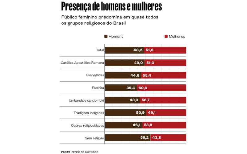 Montero, por sua vez, destaca que a maior parte da população que se declara religiosa no país é feminina. Assim, em todas as tradições, o grupo representa mais de 50% dos fiéis (ver gráfico abaixo). A predominância, observa a antropóloga, está diretamente relacionada à função que as instituições religiosas desempenham na vida cotidiana. “Esses espaços respondem a muitas das necessidades familiares, domésticas e sociais das mulheres pobres do Brasil”, justifica. Segundo a pesquisadora, instituições católicas e evangélicas oferecem assistência em áreas em que o Estado não chega, tanto no apoio material como no acolhimento simbólico.
