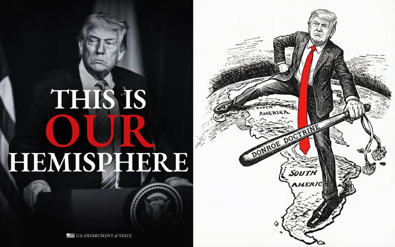 A lógica de dominação de Trump tem ligação também com a atualização de doutrinas passadas. Peter Hegseth, secretário de Defesa dos Estados Unidos, chegou a retweetar em sua conta no X uma charge onde o Presidente Donald Trump está pisando em cima da América Latina com um bastão escrito “Doutrina Donroe” – que junta o nome “Doutrina Monroe” com o nome do presidente, Donald Trump. O post já tem mais de 700 mil visualizações e 2,7 mil compartilhamentos. Já o Departamento de Estado dos EUA, publicou na mesma rede social, uma imagem de Trump editada em preto em branco com a frase, destacada em vermelho, “This is Our Hemisphere” (Esse é o nosso Hemisfério, em tradução livre) A publicação teve mais de 15 milhões de visualizações e 15 mil compartilhamentos.