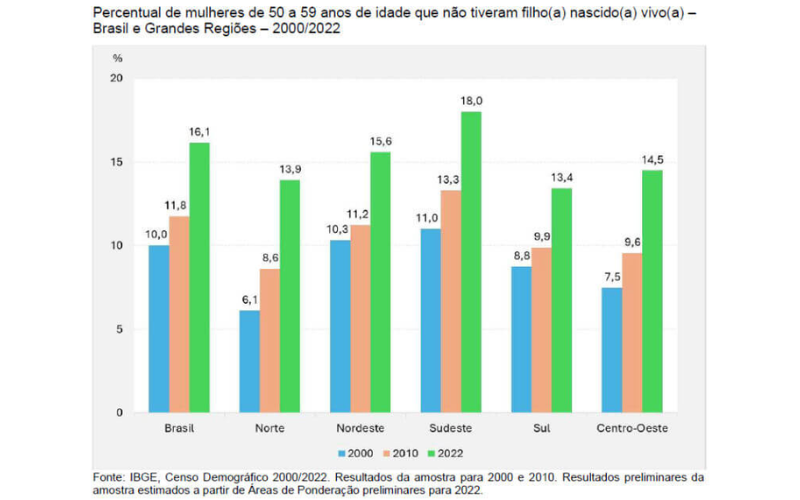 No Brasil, o percentual de mulheres de 50 a 59 anos que não tiveram filho nascido vivo em 2000 era de 10,0%, passando para 11,8% em 2010 e para 16,1% em 2022. Apesar da Região Norte ter sido aquela que apresentou o menor percentual de mulheres de 50 a 59 anos que não tiveram filho nascido vivo (6,1% em 2000, 8,6% em 2010 e 13,9% em 2022), também foi aquela que apresentou o maior aumento na medida (com 7,8 pontos percentuais para mais). Já a Região Sudeste foi aquela que apresentou o maior percentual de mulheres de 50 a 59 anos que não tiveram filho nascido vivo (11,0% em 2000, 13,3% em 2010 e 18,0% em 2022).