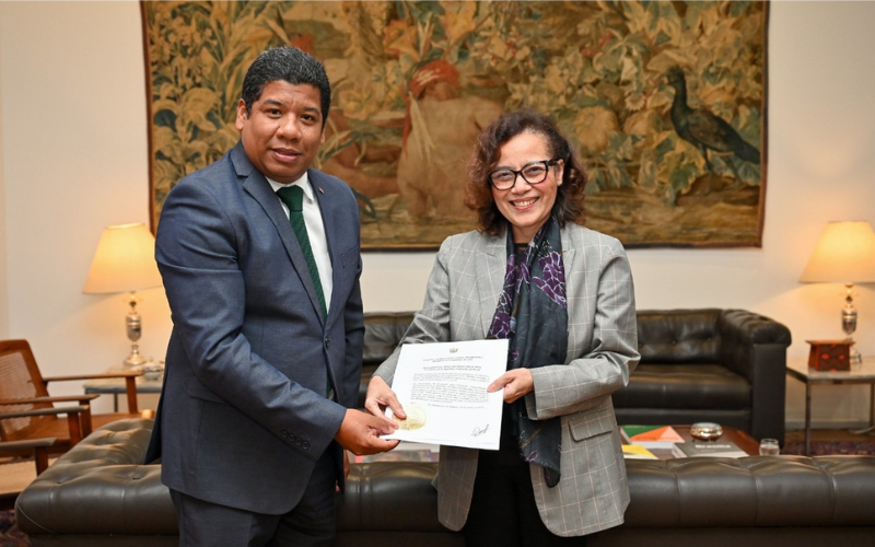 O Embaixador Victor Manuel Cairo Palomo entrega as cópias figuradas de suas cartas credenciais à Secretária-Geral das Relações Exteriores do Brasil, Embaixadora Maria Laura da Rocha. Foto: Letícia Clemente | MRE