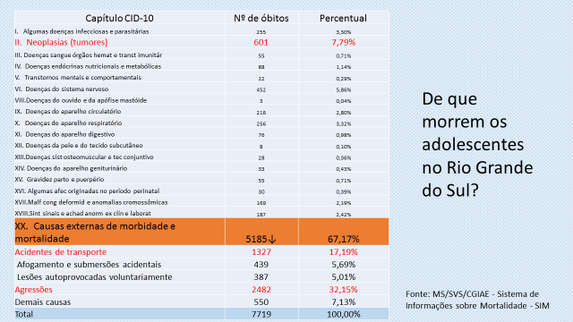 Considerando o número absoluto de óbitos em 2016, podemos dizer que a cada dia no estado do Rio Grande do Sul morrem três adolescentes, dos quais duas mortes são ocasionadas por causas evitáveis! Esse foi um resultado expressivo da pesquisa.