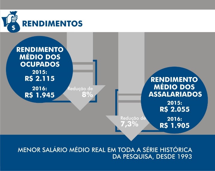 Como em 2015, a taxa de desemprego total registrou acentuado crescimento, passando de 8,7% em 2015 para 10,7% em 2016, acrescentando 33 mil pessoas no contingente de desempregados (estimado em 202 mil indivíduos). O rendimento médio real dos ocupados também teve grande redução em 2016, comportamento que havia se verificado no ano anterior, com quedas de 8,0% para os ocupados e de 7,3% para os assalariados. Em 2016, o rendimento médio real passou a corresponder a R$ 1.945, e o salário médio real, a R$ 1.905, sendo o menor salário médio real desde o início da série em 1993.