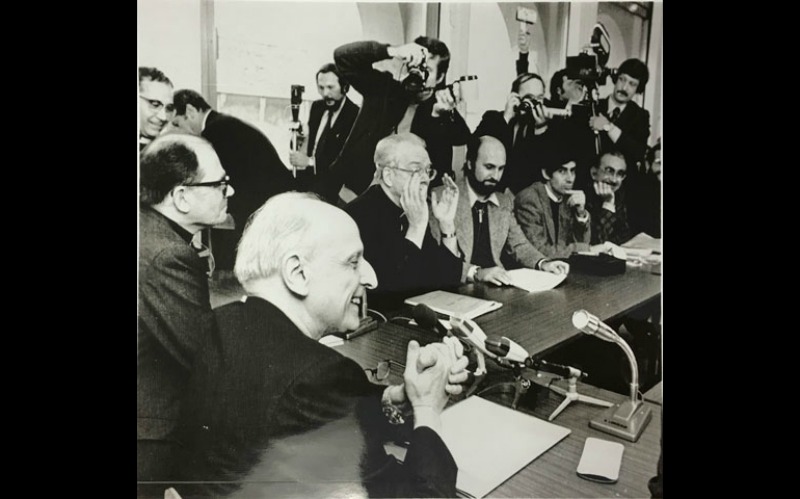 O Pe. Pedro Arrupe, SJ, em primeiro plano, sorri durante uma coletiva de imprensa realizada antes da 32ª Congregação Geral, iniciada em Roma no dia 03-12-1974. (CNS)