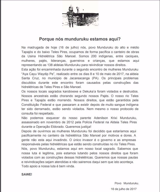 Em carta aberta divulgada no dia 16, os manifestantes mostram que o movimento é pacífico e foi planejado desde maio, no encontro de mulheres Munduruku “Aya Cayu Waydip Pe”, na aldeia Santa Cruz. Os principais problemas enfrentados atualmente pelos indígenas da bacia do Tapajós, estão ligados diretamente - segundo eles - às usinas Teles Pires e São Manoel. A primeira, já em funcionamento, e a segunda aguardando a licença de operação.