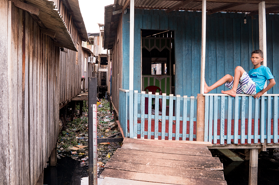 As paredes guardam as marcas da última enchente, que ocorreu em agosto, fora da época de chuvas. O pintor Carlos Alves Moraes, de 52 anos, mostra na régua os níveis que a água atingiu quando entrou nas palafitas. “Ficamos 17 dias morando aqui com os pés embaixo d’água”, relembra. “Essa daí foi uma que ficou com o pé todo cheio de ferida por causa da água”, diz, apontando para a esposa. Na palafita de dois cômodos, Carlos – indígena Xipaia – se aperta com mais dez pessoas. Os móveis estão todos sobre banquinhos, a única proteção contra o próximo aguaceiro.