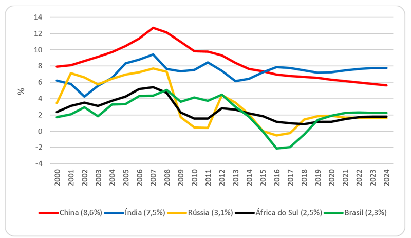 Taxa de crescimento do PIB da China, Índia, Rússia, África do Sul e Brasil