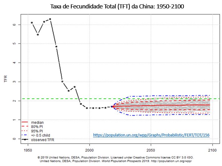 Em consequência, mesmo com a maior parte da população vivendo no meio rural, a fecundidade continuou caindo e a TFT ficou abaixo do nível de reposição no quinquênio 1990-95 (com 1,9 filho por mulher) e se manteve ao redor de 1,6 filho por mulher entre 2000 e 2015. Ou seja, depois de cerca de 35 anos de “Política de filho único” a TFT chinesa permanece baixa e o número de nascimentos anuais caiu de pouco mais de 30 milhões no quinquênio 1965-70 para cerca de 17 milhões de bebês na atual década (2011-20).