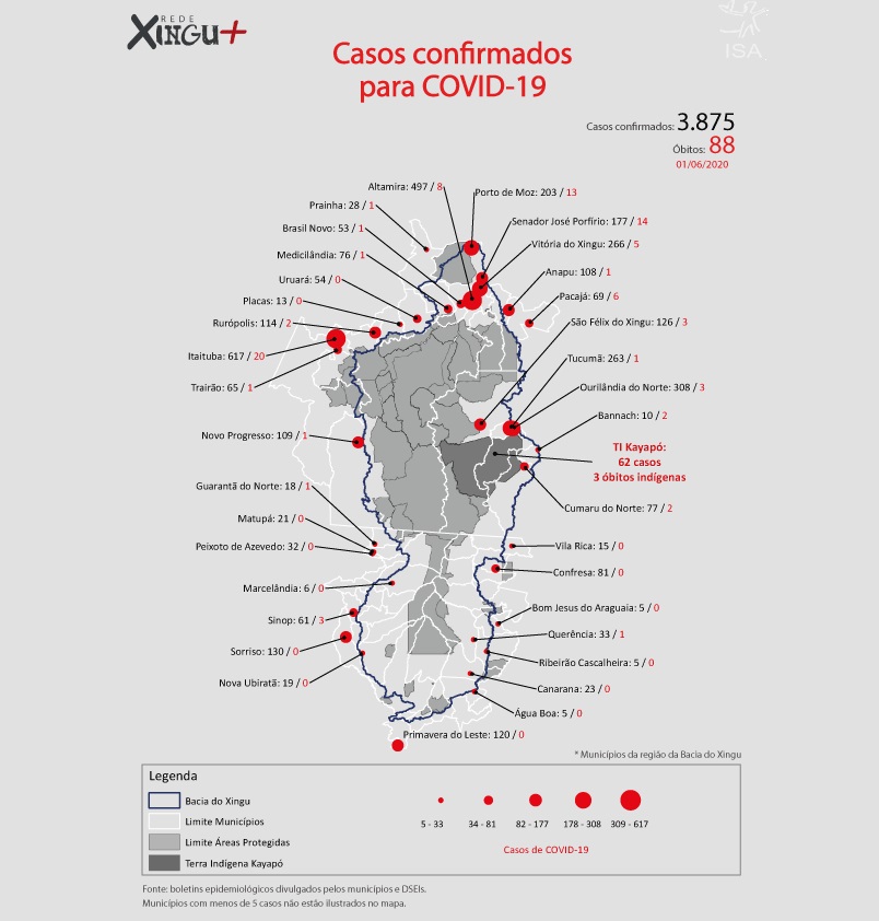 Três indígenas Kayapó morreram na última semana vítimas de Covid-19 na Terra Indígena (TI) Kayapó, os primeiros óbitos notificados dentro de uma TI na bacia. Já são 62 casos em cinco aldeias, segundo o Distrito Sanitário Especial Indígena (Dsei) Kayapó, que ainda contabiliza 11 casos suspeitos e 111 notificações em análise.