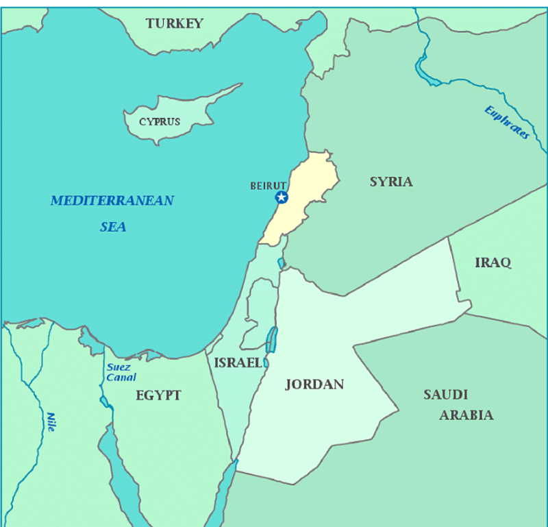 Mapa do Líbano, com a capital Beirute em destaque, e países vizinhos. (Foto: ResearchGate)