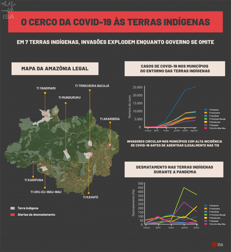 Nas TIs Trincheira-Bacajá, Kayapó e Mundurucu, no sudoeste do Pará, o desmatamento aumentou, respectivamente, 827%, 420% e 238%, entre março e julho. Elas estão no grupo das sete terras homologadas (com demarcação concluída) mais invadidas da Amazônia Legal, junto com as TIs Karipuna e Uru-Eu-Wau-Wau (RO), Araribóia (MA) e Yanomami (AM/RR). No período de chegada e crescimento da epidemia no país, foram destruídos 2,4 mil hectares de florestas nas sete áreas, o equivalente a 15 vezes o Parque do Ibirapuera, em São Paulo.