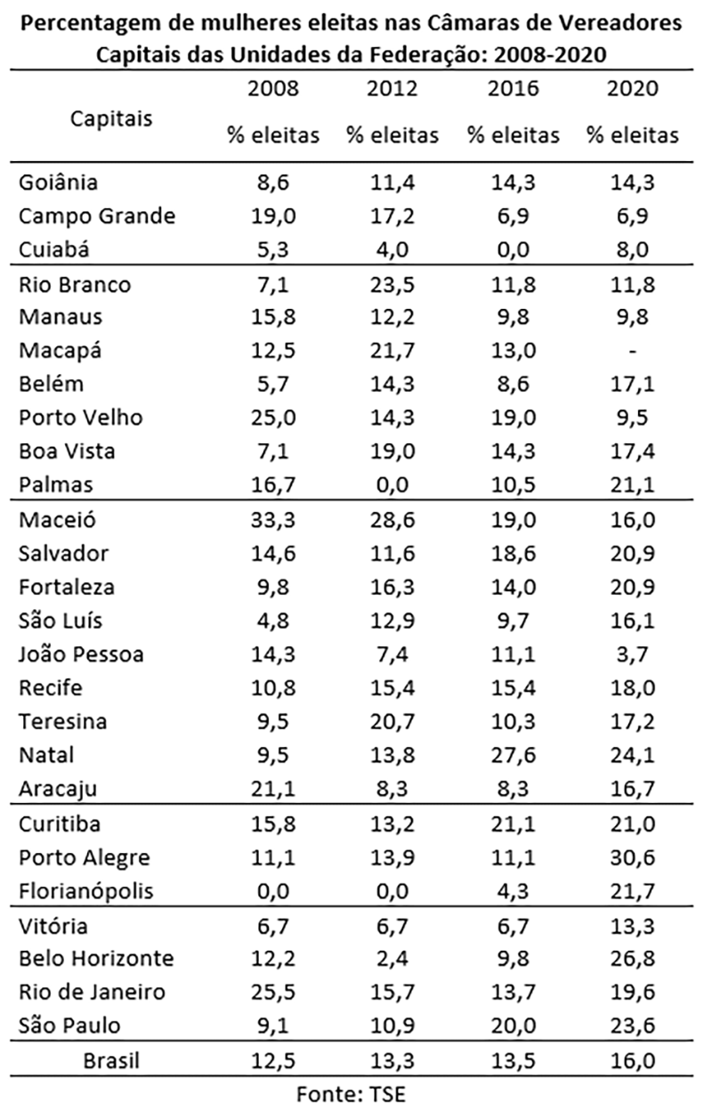 Percentagem de mulheres eleitas nas câmaras de vereadores nas capitais, 2008-2020. (Fonte: TSE)