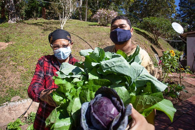 Thiago e sua mãe, Tia Nice, em horta orgânica cultivada por eles em Juquitiba (SP). Dali saem verduras, legumes e hortaliças para as marmitas que são feitas diariamente no Organicamente Rango, o restaurante da Agência Solano Trindade que distribuiu 35 mil marmitas desde o começo da pandemia (Teia Documenta | Greenpeace Brasil)