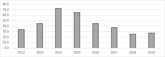 Gráfico 2 – Valores pagos em “Políticas para as mulheres¹” (em milhões de R$), corrigido pelo INPCFonte: Adaptado de Oliveira, Passos, Guidolin, Welle e Nassif-Pires (2020)