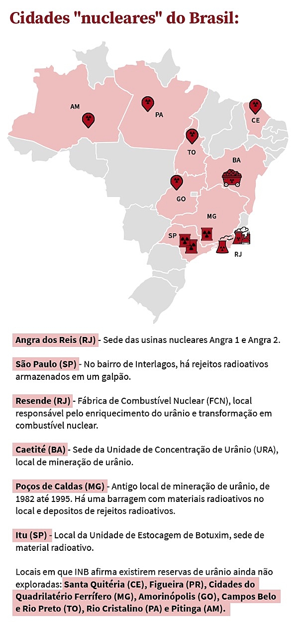 Cidades de interesse da atividade nuclear brasileira. (Infográfico: Brasil de Fato)