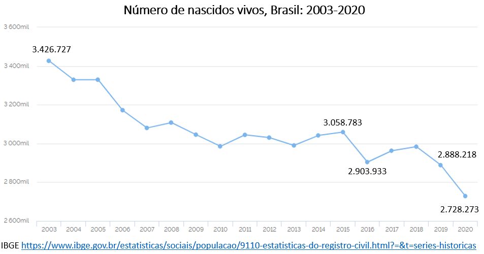 As estatísticas do Registro Civil do IBGE também apontam para uma redução do número de nascimentos, conforme mostra o gráfico abaixo. Em 2003 nasceram 3,4 milhões de bebês no Brasil e o número de nascimentos ficou acima de 3 milhões até 2015. Em 2016 houve uma queda abrupta em decorrência da epidemia da Zika, quando o número de nascimentos caiu de 3,1 milhões para 2,9 milhões (queda de 5%). Mas houve recuperação nos dois anos seguintes e uma nova queda em 2018 para a casa de 2,9 milhões de bebês. De 2019 para 2020 a queda foi de 2,9 milhões para 2,73 milhões (redução de 5% dos nascimentos). Portanto, o efeito da pandemia da covid-19 sobre a queda dos nascimentos foi semelhante ao efeito da epidemia da Zika.