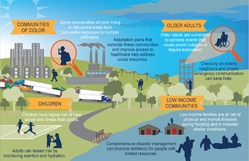 Os impactos das mudanças climáticas são vistos em todos os aspectos do mundo em que vivemos. No entanto, os impactos das mudanças climáticas são desiguais em todo o país e no mundo – mesmo dentro de uma única comunidade, os impactos das mudanças climáticas podem diferir entre bairros ou indivíduos. Desigualdades socioeconômicas de longa data podem tornar os grupos carentes, que geralmente têm a maior exposição a riscos e menos recursos para responder, mais vulneráveis.