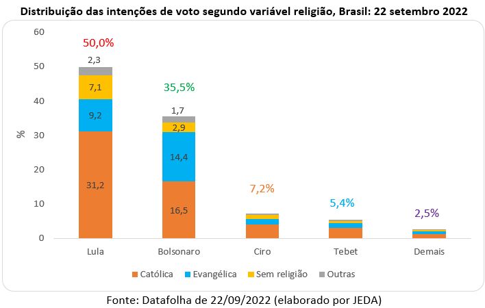 A pesquisa do Instituto Datafolha, publicada no dia 22 de setembro, indicou intenção de voto de 47% em Lula, 33% em Bolsonaro, 7% em Ciro Gomes, 5% em Simone Tebet, 2% nos demais candidatos e 6% em votos nulos, brancos e não sabem. Considerando os votos válidos, Lula ficou com 50%, Bolsonaro com 35,5%, Ciro com 7,2%, Tebet com 5,4% e os demais candidatos com 2,5%. Na amostra da pesquisa Datafolha, os católicos representam 56% do eleitorado, os evangélicos 27%, os sem religião 12% e 5% para as demais religiões.