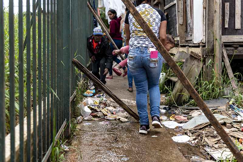 Em setembro, ela também conseguiu receber a primeira parcela dos R$ 600 do Auxílio Brasil, “o que trouxe um pouco de melhora”. Mas o dinheiro não cobre as despesas com quatro crianças com idades entre 1 e 7 anos. Além do gás e das contas de água e de luz, é preciso comprar mais leite, fraldas, produtos de higiene e roupas. O que garante que seus filhos comam todos os dias com alguma qualidade é a escola. “Prefiro levar porque eles tomam café e almoçam lá. Chegam em casa e a gente só tem que dar uma coisinha.” Mas naquela semana chuvosa, em que as vielas se transformaram em pequenos riachos e foi preciso se equilibrar em pedaços de madeira para caminhar sem se molhar, as crianças tiveram que ficar em casa.