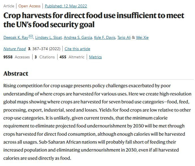 Estudo recente publicado na revista científica Nature Food, em um trabalho de cooperação internacional, mapeou os dez principais produtos agrícolas do mundo e sua destinação. A descoberta acende um sinal de alerta para a desnutrição em vários países, mostrando que plantações com uso direto de alimento são insuficientes para cumprir com o segundo ODS (Objetivo de Desenvolvimento Sustentável da Organização das Nações Unidas). A meta diz respeito à segurança alimentar para todas as pessoas até 2030.