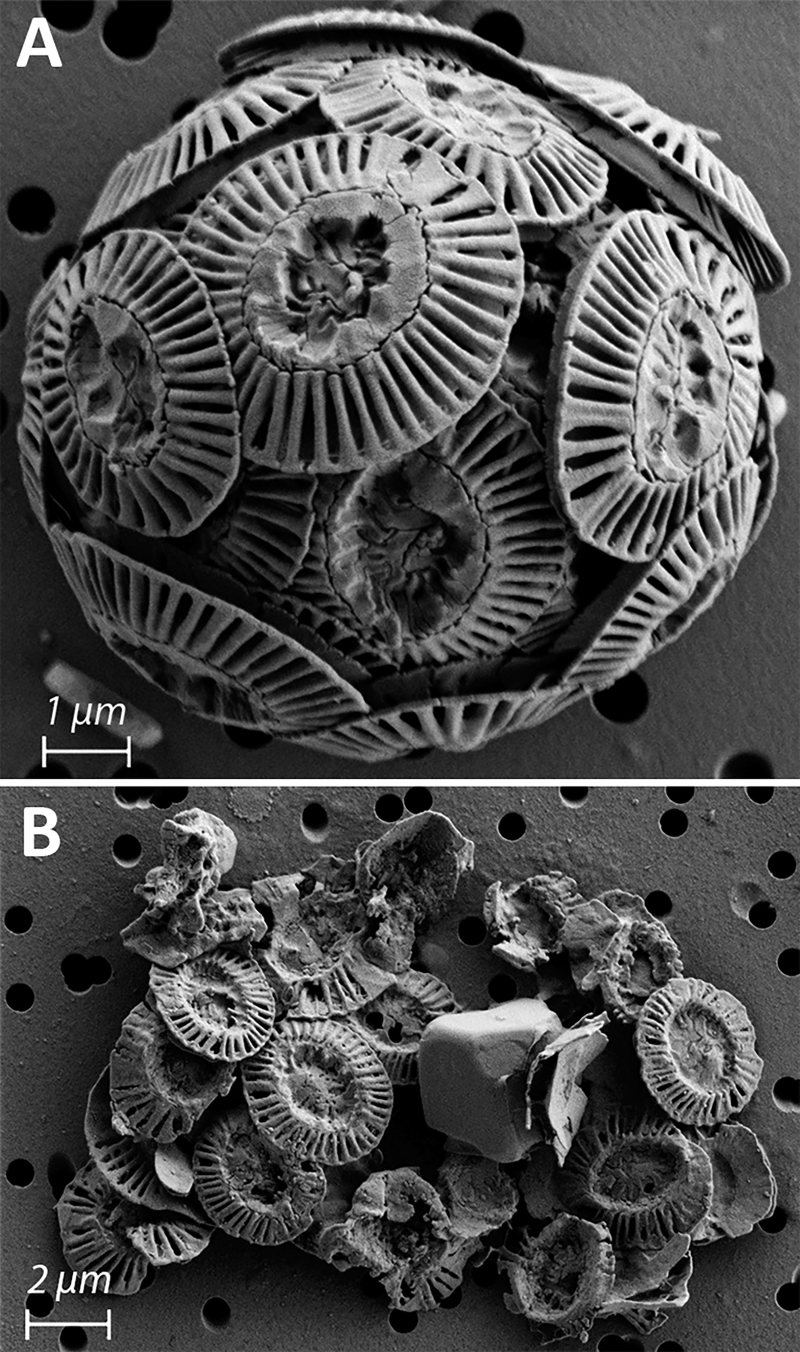 ( A ) Uma cocosfera intacta e ( B ) uma cocosfera colapsada de Emiliania huxleyi. Imagens obtidas com um microscópio eletrônico de varredura de mesa Phenom G2 pro.